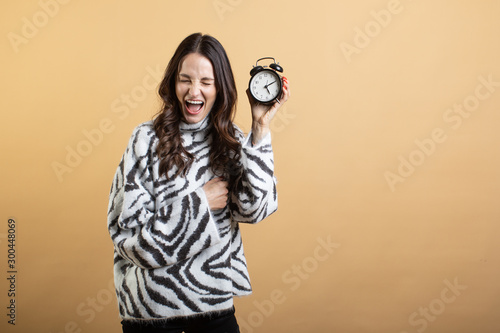 Fototapeta premium Image of a young beautiful woman posing isolated against an orange wall holding an alarm clock