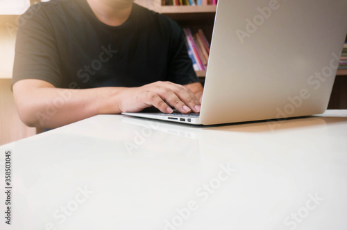 © Charlie's, Fototapeta premium image of a young man working on his laptop in library, rear view of business man hands busy using laptop at office desk, young male student typing on computer sitting at wooden table