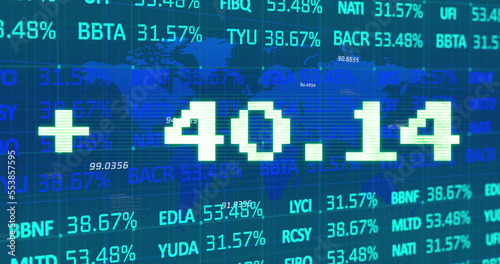 © vectorfusionart, Obraz premium Image of addition symbol with numbers and trading board against map over blue background