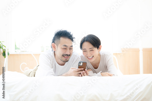 Fototapeta premium Image of an Asian couple lying down and looking for something on their phone.