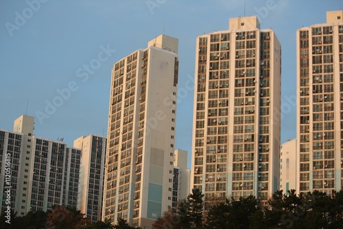 © TS, Fototapeta premium Image of apartments, sky, and clouds near Daecheongcheon walking trail