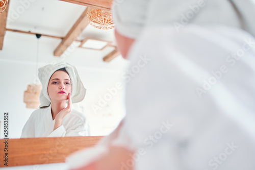 © Sergey Mironov, Fototapeta premium Image of beautiful woman in bathrobe and with towel on her head reflected in mirror