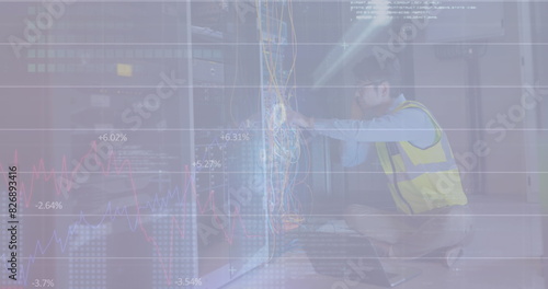 © vectorfusionart, Obraz premium Image of binary codes and programming language, caucasian man checking data server hardware
