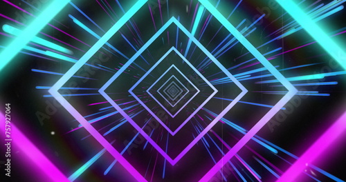 © vectorfusionart, Obraz premium Image of blue neon light trails and squares over black background