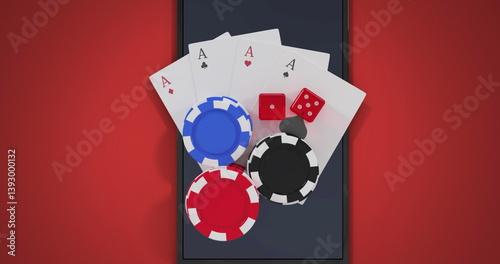 © vectorfusionart, Obraz premium Image of casino chips, dice and playing cards over smartphone