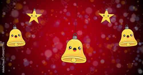 © vectorfusionart, Fototapeta premium Image of christmas bells and stars decoration over snow falling on red background