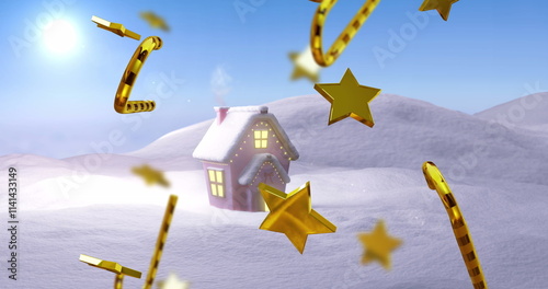 Naklejka premium Image of christmas stars and candy canes, snow and house in winter scenery
