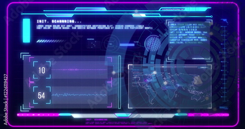 © vectorfusionart, Obraz premium Image of circular scanner over charts processing data on interface screen