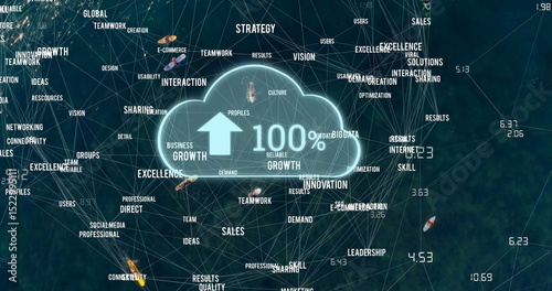 © vectorfusionart, Obraz premium Image of cloud with growing number and network of connections with texts over sea with boats