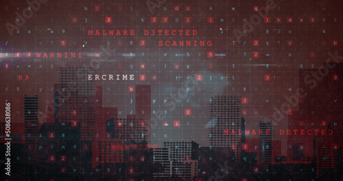 © vectorfusionart, Obraz premium Image of cyber attack warning over cityscape on red background