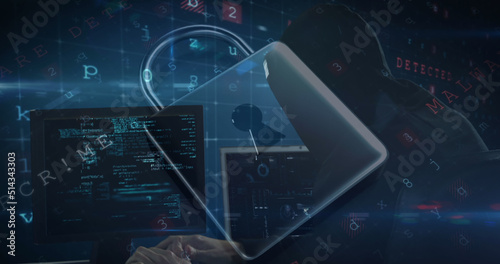 Fototapeta premium Image of cyber attack warning over online security padlock and hacker