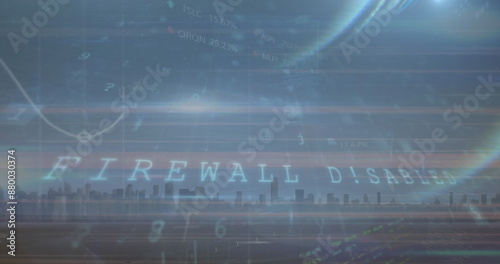 © vectorfusionart, Fototapeta premium Image of cyber security data processing and light trails against view of cityscape