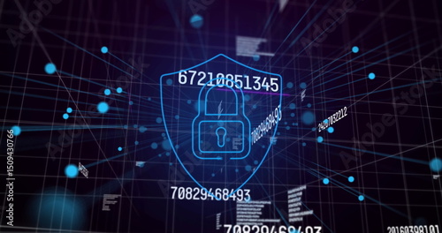 © vectorfusionart, Fototapeta premium Image of data processing and digital shield with padlock on black background