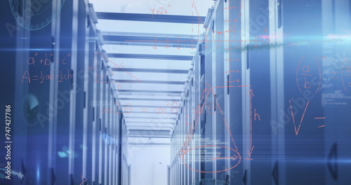 Obraz premium Image of data processing and mathematical equations against computer server room