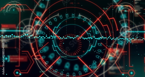 © vectorfusionart, Obraz premium Image of data processing and scope scanning over car panels