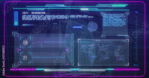 © vectorfusionart, Obraz premium Image of data processing on moving screens over blue background