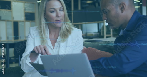 © vectorfusionart, Obraz premium Image of data processing over diverse business people at office