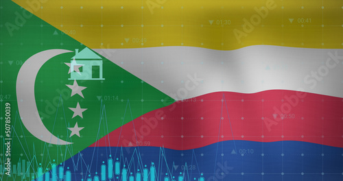 © vectorfusionart, Naklejka premium Image of data processing over flag of comoros