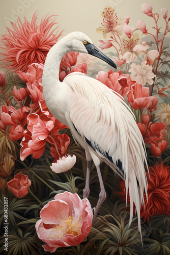 Fototapeta premium Image of demoiselle crane with beautiful red flowers in the forest on a...
