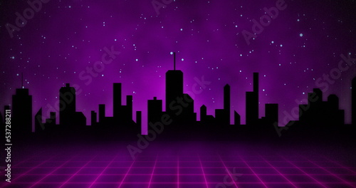 © vectorfusionart, Fototapeta premium Image of digital purple space with city and stars