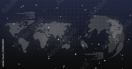 © vectorfusionart, Naklejka premium Image of dots and data processing over world map and rotating globe on navy background
