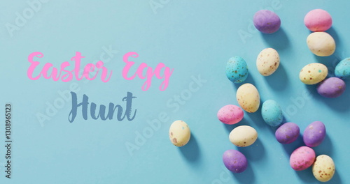 © vectorfusionart, Fototapeta premium Image of easter egg hunt and happy easter text over blue background