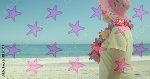 © vectorfusionart, Naklejka premium Image of falling stars over caucasian senior women