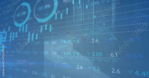 © vectorfusionart, Obraz premium Image of financial data processing over blue background