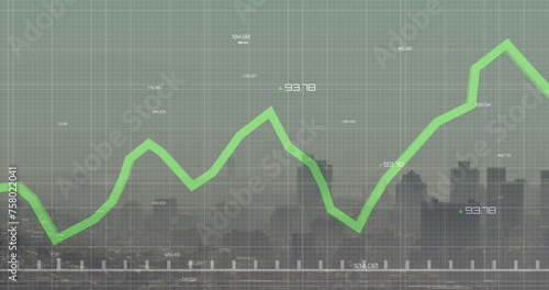 © vectorfusionart, Naklejka premium Image of financial data processing over cityscape