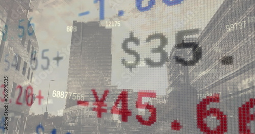 © vectorfusionart, Obraz premium Image of financial data processing over cityscape