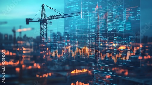 © The Little Hut, Fototapeta premium Image of financial data processing over crane and construction site global development business finance digital interface and data processing concept digitally generated image : Generative AI