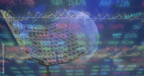 © vectorfusionart, Obraz premium Image of financial data processing over globe and solar panel
