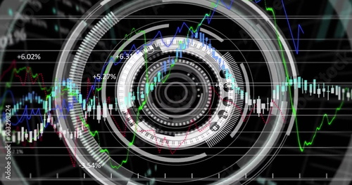 © vectorfusionart, Obraz premium Image of financial data processing over scope and grid on dark background