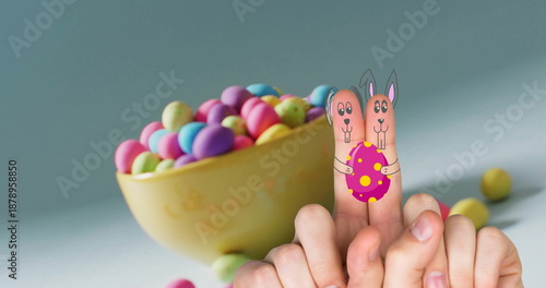 Fototapeta premium Image of fingers with easter bunny faces and easter eggs on blue background