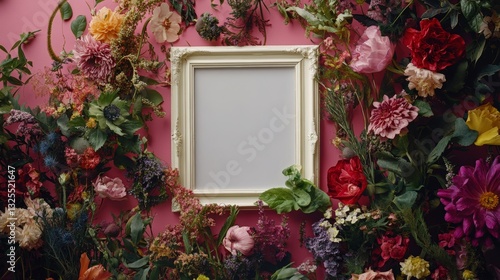 © nelzajamal, Naklejka premium image of fresh flowers of various colors and green leaves placed around empty white photo frame against pink background - ai
