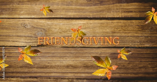 © vectorfusionart, Fototapeta premium Image of friendsgiving text over autumn leaves on wooden boards