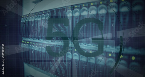 © vectorfusionart, Obraz premium Image of 5g text banner and round scanners over close up of a computer server