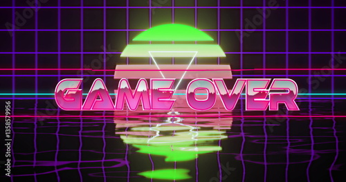 Naklejka premium Image of game over text over purple grid and digital sunset