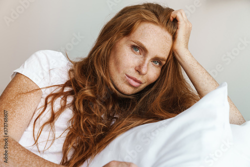 © Drobot Dean, Fototapeta premium Image of ginger pleased woman looking at camera while lying in bed