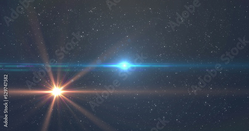 © vectorfusionart, Fototapeta premium Image of glowing blue and orange light moving over spots of light and stars in background