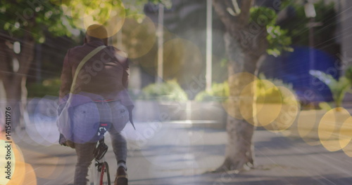 Naklejka premium Image of glowing lights over african american businessman cycling in city