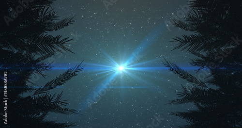 © vectorfusionart, Fototapeta premium Image of glowing spot flickering and disappearing on night sky with stars surrounded by trees