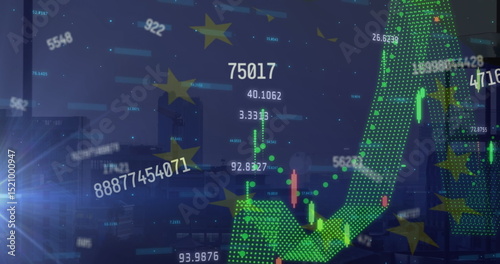 © vectorfusionart, Obraz premium Image of graphs, eu flag and numbers over cityscape
