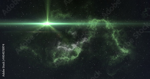 © vectorfusionart, Fototapeta premium Image of green glowing light over clouds and twinkling stars on black background