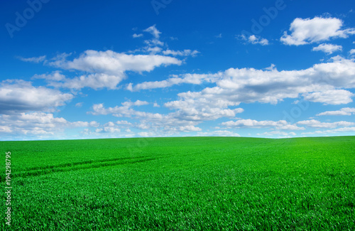 © nata777_7, Fototapeta premium Image of green grass field and bright blue sky