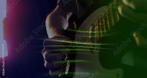 © vectorfusionart, Fototapeta premium Image of green light trails over slow motion hand of musician playing electric guitar