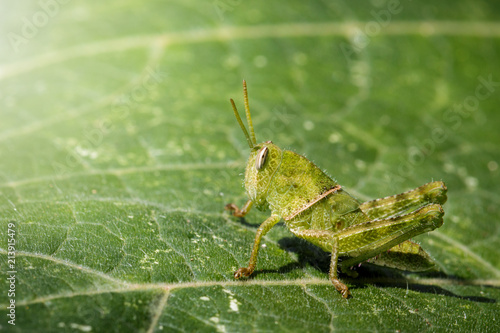 Fototapeta premium Image of Green little grasshopper on a green leaf. Insect. Animal