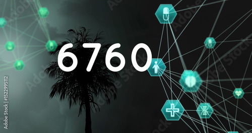 Obraz premium Image of growing number and globe of connections with icons over palm tree and lightning