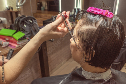 Naklejka premium Image of hairdresser hand cuts client hair with scissors. Hairdresser cuts...