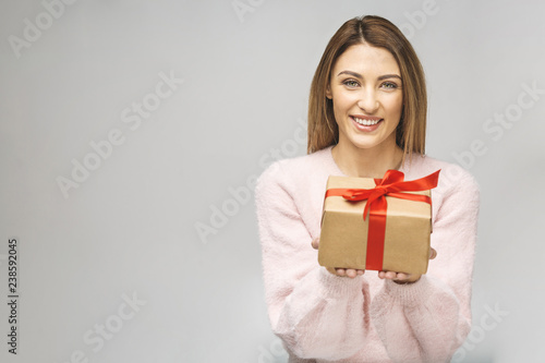 Fototapeta premium Image of Happy brunette woman in casual holding gift box and looking at the camera isolated over white background.